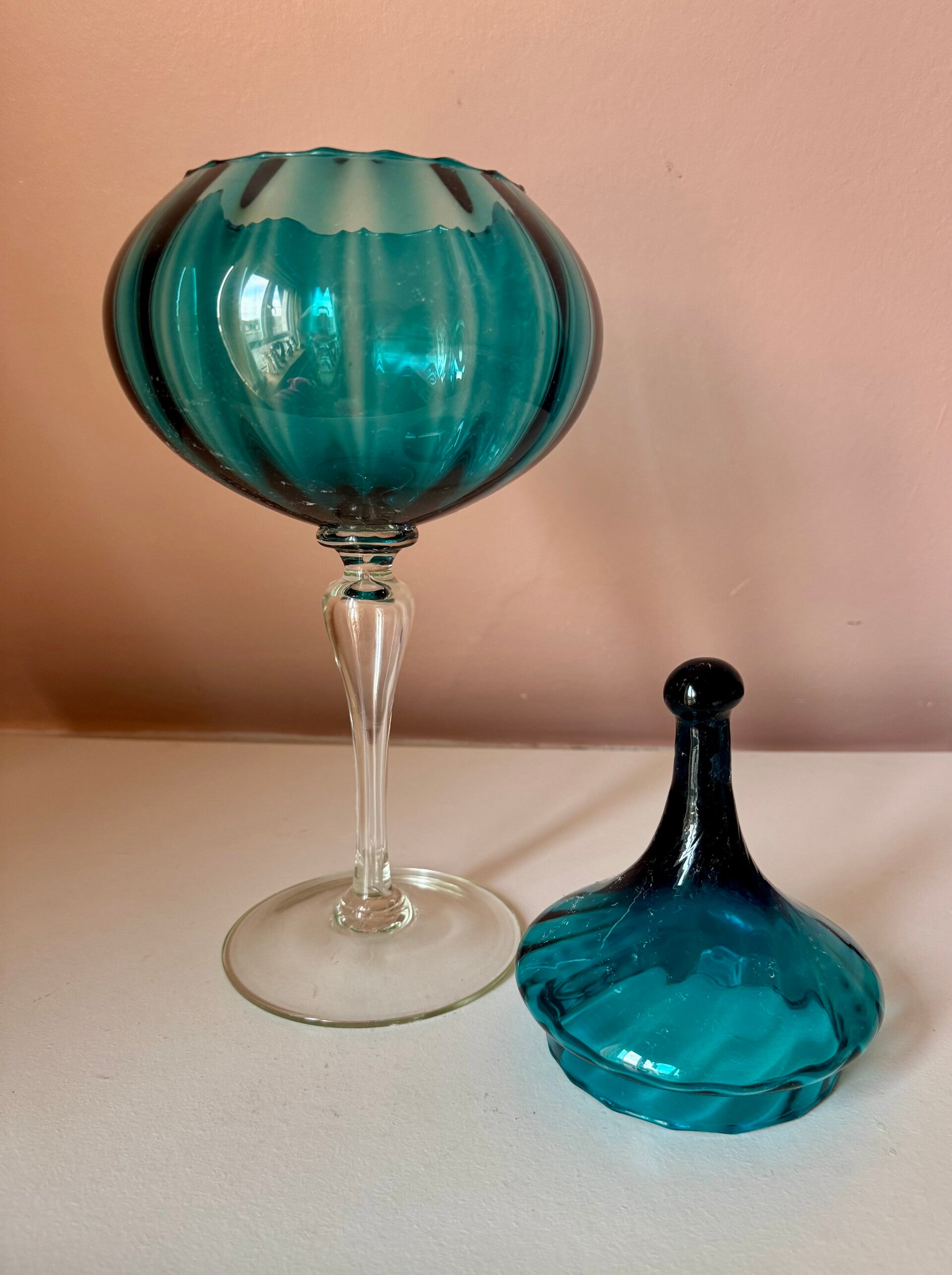 In a vibrant teal hue with optic ribbed or circus tent texture made in Italy mid 20th century